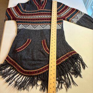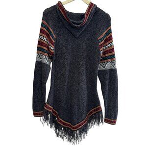 Style: A pullover "poncho-sweater" hybrid with a relaxed tunic fit and a distinct fringed hemline.