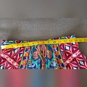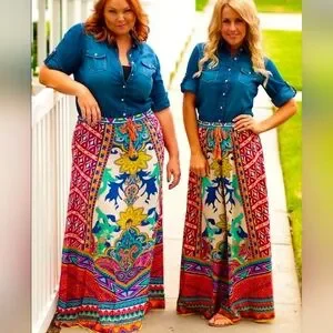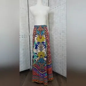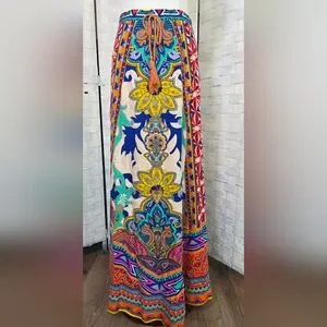 Vibrant multicolor boho maxi skirt with an eye-catching paisley and floral pattern. Elastic waistband for a comfortable, flattering fit. Lightweight flowy fabric ideal for everyday wear and special outings. Easy to wear slips on with elastic waist. In excellent condition
