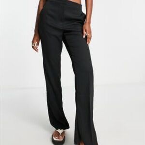 Sleek black tailored trousers with a straight-leg silhouette. Smooth front and clean lines create a polished, professional look. Comfortable mid-rise waist with subtle pockets for everyday wear. Versatile black color pairs easily with blouses and blazers for office or events.