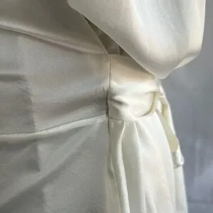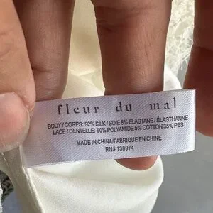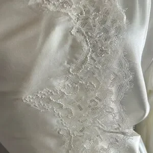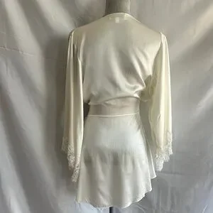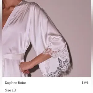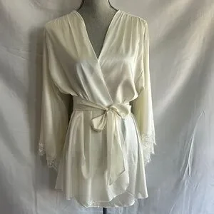 Lace angel sleeve robe in luxe silk charmeuse with hand-beaded French lace appliqué at sleeves and back. Features a playful fit with wide sleeves. Wraps across the body and is secured by a sash. Small spot on front will more than like out come out once cleaned. Perfect as a bridal robe. 92% Silk, beading in tact. Collab with Fleur du Mal. Still available on originally website. Size M/L. Original retail$495 Open to offers.