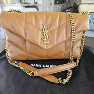 Saint Laurent shoulder bag in cognac calfskin. Quilted chevron pattern across the front. Prominent YSL logo in gold. Gold chain strap with leather shoulder pad. Sleek, structured silhouette for versatile wear. Pristine condition with dustbag. NWOT