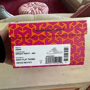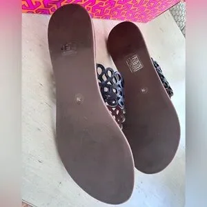 Eye-catching laser-cut leather upper in navy colorway. Smooth brown footbed with contrast stitching. Easy slip-on thong style for warm-weather wear. Iconic Tory Burch medallion detail on the sole. Rarely worn as you can see from photos of bottom of the shoes, almost brand new condition! Size 7. Comes with original shoe box.
