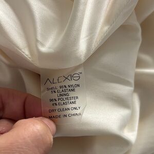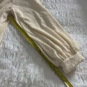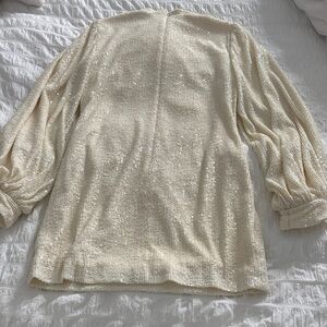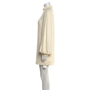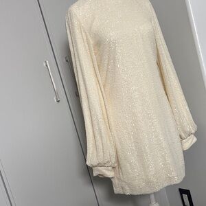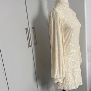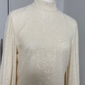 Alexis Lunia sequined high-neck blouson-sleeve dress in cream. It features an all-over sequin embellishment, long blouson sleeves with cuffs, and a mock neckline. Worn for 2 hours. Excellent like new condition. Quality piece. Stunning in person. Size small.