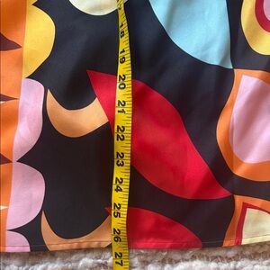 Vibrant button-up shirt with geometric patterns. Features shades of red, yellow, and black.