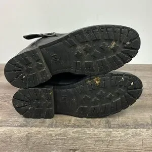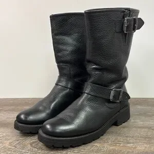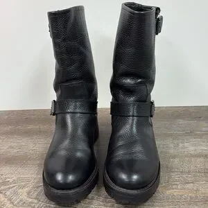 Classic Frye mid-calf boots in smooth black leather. Chunky lug sole and low block heel. Adjustable buckle straps at ankle and calf. Clean, versatile style for everyday wear.