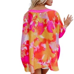 COLORFUL OVERSIZED WATERCOLOR PRINT BOHO FAUX TUCK RESORT FLOWY CAFTAN TOP OS