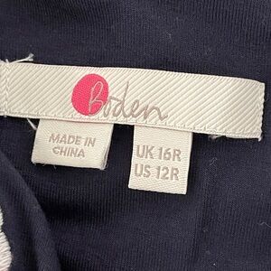 Soft navy knit top. Features a stitched Boden label with pink logo. Classic, casual layering piece. Neutral styling for everyday wear.