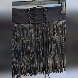Chic mini skirt with fringe and lace-up front. Eye-catching gold accents. Perfect for a bold look.