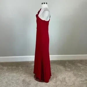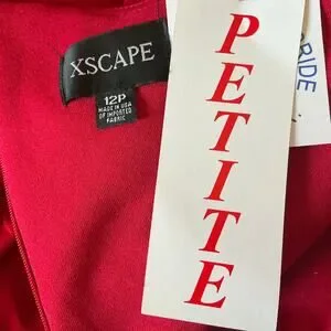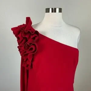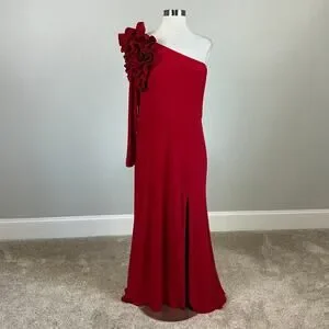 Keywords: XSCAPE, Red, One Shoulder, Long Sleeve, Evening Gown, Size 12P, Petite, Ruching, Asymmetric, Black Tie, Gala, Prom, Pageant, Wedding Guest, Evening, Red Carpet.
