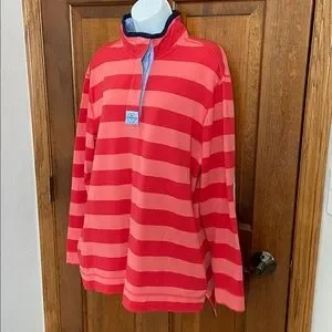 Southern Tide Striped Skiptide Pullover in Fire Red Rugby Mock Neck Collar / Length is Long