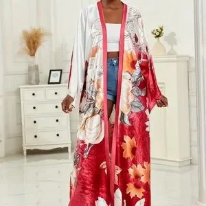 New Resort Ready Beach Kimono. Features an all over floral Print Full Length. Wide sleeved. Matching Tie belt. 100% Polyester. Silky Satin feel. Machine washable