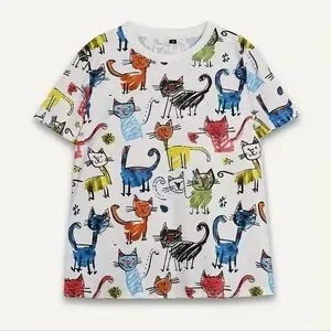 Colorful cartoon cat print short sleeve shirt with abstract print and a crew neck