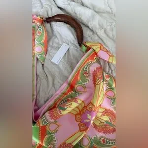 Vibrant paisley-print shoulder bag by Street Level. Bright pink base with bold orange and green accents. Wooden top handle for a chic touch. Soft, draped silhouette. Eye-catching and stylish for daytime looks.