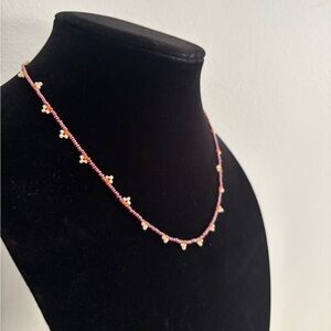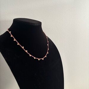 This elegant beaded necklace features delicate pink accents, perfect for adding a touch of sophistication to any outfit.