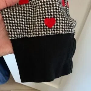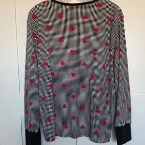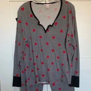 Long-sleeve pajama top from Victoria's Secret. Black-and-white houndstooth base with scattered red heart print. Black trim at neckline and cuffs. Soft, cozy sleepwear style. Cute and playful design. Excellent condition no wear