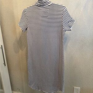 Triple fleece. Classic navy and white striped polo-style dress. Short sleeves with a notch collar for effortless wear. 100% cotton, flattering silhouette.