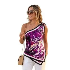 Y2K Vintage Bebe Silk Purple Black Abstract One Shoulder Print Top Blouse Large
