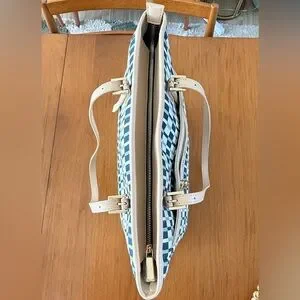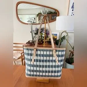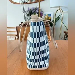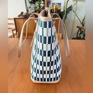Spartina 449 Linen & Leather Tote – Brand New Coastal Carryall – White, Navy & Light Blue Woven Bag with Beige Leather Trim – Resort Style Shoulder Bag