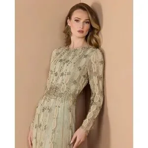 Mac Duggal NEW Embellished Mesh Long Sleeve A Line Gown Nude Sage