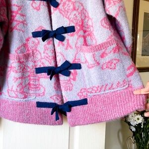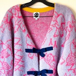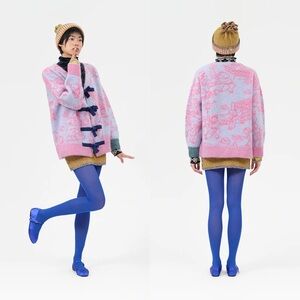 Tags: yanyan knits, designer cardigan, alpaca cardigan, oversized cardigan, jacquard sweater, fuzzy knit, luxury knitwear, statement sweater, kawaii fashion, whimsical knit, art sweater, pastel cardigan, pink blue sweater, fall winter layering, cozy cardigan