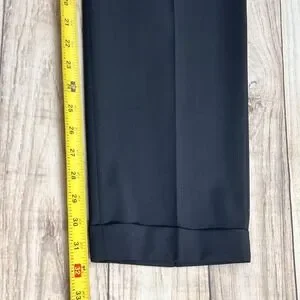 The Ralph Lauren BLACK LABEL Wool Pleated Cuffed Pants in size 42x32 are a premium quality men's dress pant designed for a classic fit. These versatile pants feature a comfortable and stretchy material blend of polyester, spandex, and viscose, making them suitable for all seasons. The black color and solid pattern add a touch of sophistication, while the pleated front and cuffed hem give them a stylish and timeless look. Perfect for casual occasions or dressed-up events, these pants are a wardrobe staple for any man looking for quality and style.