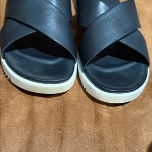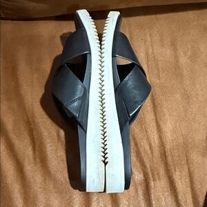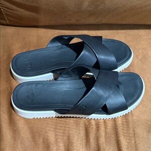 {preloved} Stylish UGG slides with wide crisscross leather straps. Cushioned footbed for comfort. Easy slip-on design for everyday wear. Neutral black and white sole contrast adds a clean look. Please review ALL pictures before purchasing. Feel free to ask questions.