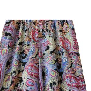 Closure: Pull OnLightweight wide-leg pants showcase a vibrant all-over paisley print in a kaleidoscope of pink, blue, yellow, and black. Designed with a comfortable high-rise elastic waistband, these pull-on trousers offer a relaxed fit through the leg, making them ideal for casual lounging or bohemian-inspired styling. The fluid fabric ensures easy movement and a breezy feel for warmer weather. This item is in excellent pre-owned condition with no visible flaws.