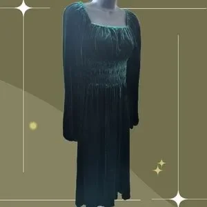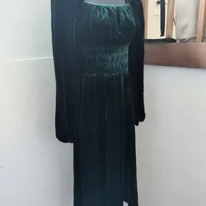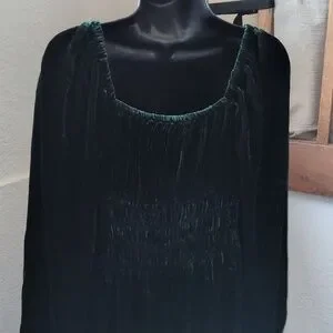 Long sleeves. elastic at the waist. Nice soft green velvet material. 80% viscose 20% silk