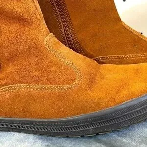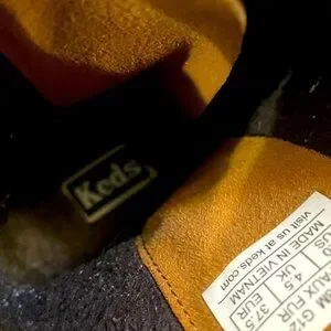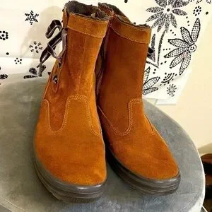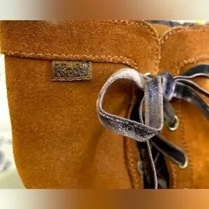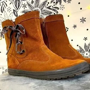 Keds leather suede lace up booties, caramel brown, boots have velvet tie detail with faux fur lining and rubber soles with good traction for bad weather. Lightly worn (some signs of wear on lining and exterior, pictured), but great condition overall! Size 7.