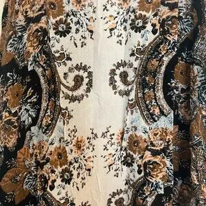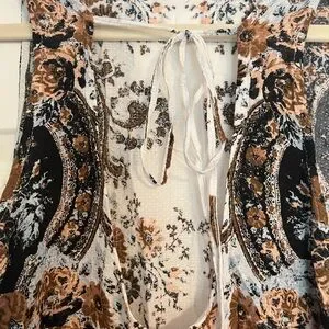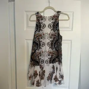 Lightweight sleeveless high-low dress with a floral paisley pattern. Flowy silhouette with a scooped neckline and breezy hem. Beautiful white and brown colorway perfect for warm-weather occasions.