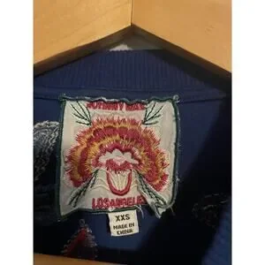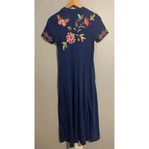 Color: Deep blue with multicolor floral and butterfly embroidery.