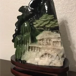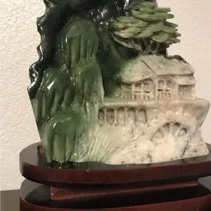 Beautiful, large Dushan Jade carved oriental scene. Measurements are shown in the images. The way this piece was carved is exquisite, as it shows a “dimensional” appearance between the mountain, trees, town and water wheel. It truly is a captivating piece. The wooden base and the green Jade carving are two separate pieces, but will be included together. Please inquire with any questions prior to purchasing and I will be happy to assist!