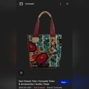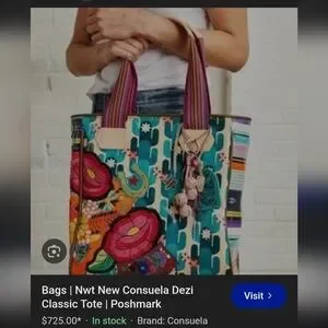EXCELLENT GENTLY USED. This is an authentic discontinued-out-of-stock Consuela Dezi Tote with the highly sought after cactus consuela cloth along with bag charms AND an authentic Consuela Rosita matching zip-around wallet (matches interior of tote). There are no stains, rips, damage, dirt, etc and has been kept in a non-smoking home. The Vachetta leather has slightly darkened as it should have (the rich patina is desirable) which indicates it has been gently used and is not brand new. The Tote is 13-1/2" Long x 14" High x 5-1/2" Deep with an 8-3/4" handle drop. The wallet is 8" Wide x 4-1/2" High x 1-3/4" Deep with 12 credit card slots, 4 storage compartments, 1 center zippered change compartment.