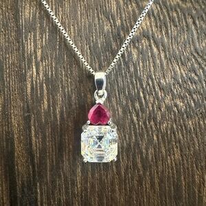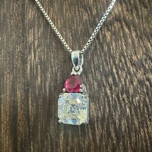 Vintage BBJ White Lab Created Strontium Titanate & Ruby Rhodium Over Sterling Silver Pendant Necklace