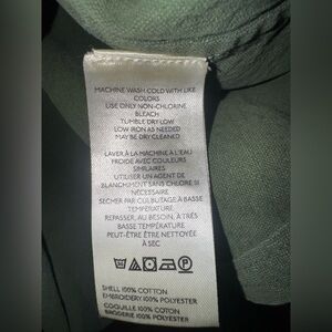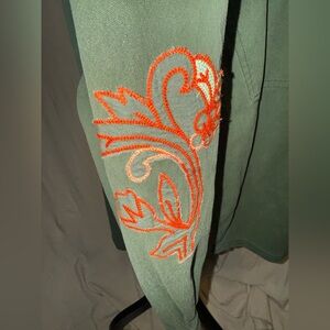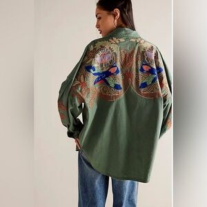 Free People green button down shirt. Features stunning embroidery on shoulders. Relaxed fit with button cuffs- Reposhing because I haven’t worn it since purchasing. It just doesn’t suit me (but I wish it did because she’s GORGEOUS!)