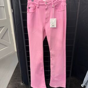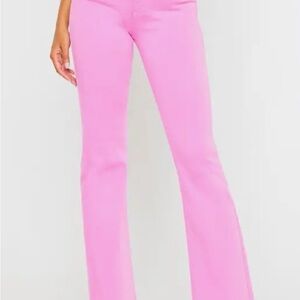 Bright pink flare jeans from KanCan. Smooth fit through hips and thighs. Flared leg for a retro silhouette. Vibrant color for standout looks. Pairs well with neutral or bold tops. The internet pictures is brighter these pink it's a soft pink perfect for spring