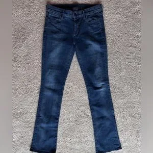 Koral Los Angelos Very Stretchy Dark Denim "Dare to Flare" Slim-Flare Jeans. Size 29. From the Koral Los Angelos signature lived in loength collection. In the eight month wash mimics worn look of eight month old jeans. Body embracing, comfortable fit. Excellent condition, only flaw is the back of the heel hems warn out a bit. See photos. Purchased from Nordstrom. Still great looking jeans. MSRP $195 Approximate measurements while laying flat - 15" across waist, 8" rise, 34.5" inseam, 8"25 leg opening. 92.5% cotton, 5% polyester, 2.5% lycra.
