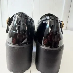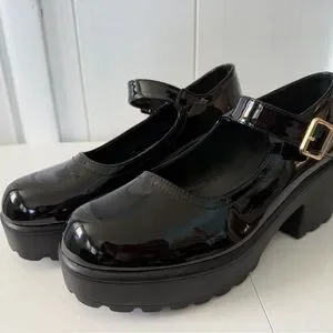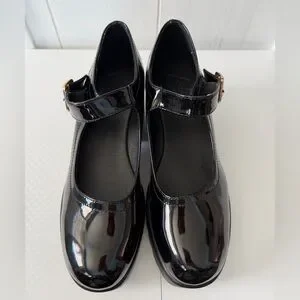 Classic black patent Mary Jane shoes. Shiny finish with a secure buckle strap for easy wear. Extremely lightweight soles.