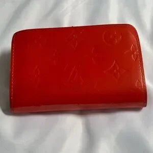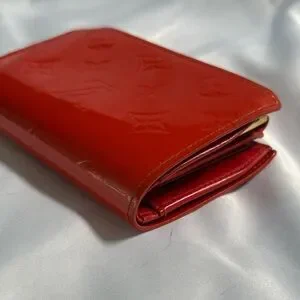 Authentic Louis Vuitton Vernis kisslock wallet in a vibrant red (Pomme D’Amour tone) featuring embossed monogram patent leather and gold-tone hardware.