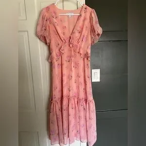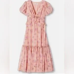 LoveShackFancy Pink Floral Puff Sleeve Chiffon Tiered Ruffle Midi Dress Size 6