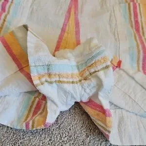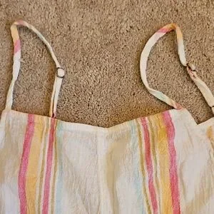 Adorable cotton romper with vibrant stripes. Features pink, yellow, and orange hues. Ideal for fun and comfort. Super lightweight, adjustable straps. Perfect for a day at the beach.