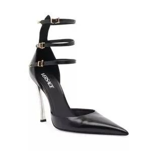 Versace's pumps are anchored by a logo-etched metal heel. Enhanced with an elongated point toe, this Italian-made pair is fastened by three dainty buckled straps.