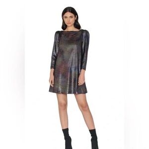 A metallic, iridescent mini dress featuring a boat neck, 3/4 length puffed sleeves, and a slip-on tunic/shift silhouette. Includes side on-seam pockets and gathered shoulder details.