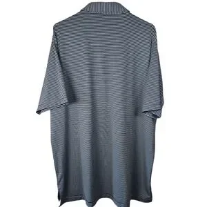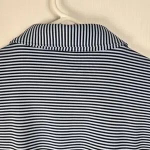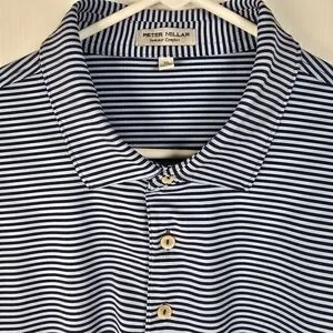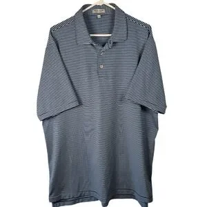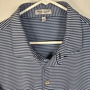 NWOT Peter Millar Summer Comfort Navy & Light Blue Striped Polo Shirt Size XL. Peter Millar short-sleeve polo with thin horizontal stripes. Three-button placket and classic collar. Soft, breathable knit ideal for casual wear. Clean, timeless striped pattern. approximate measurements