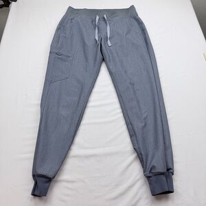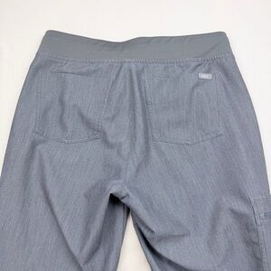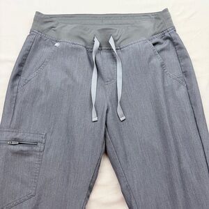 Figs women's scrub pants in muted gray. Elastic drawstring waist for a secure fit. Multiple cargo pockets for tools and essentials. Lightweight stretch fabric for mobility. Clean, professional styling.