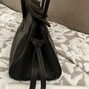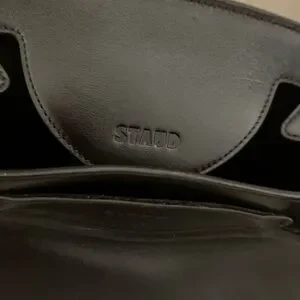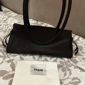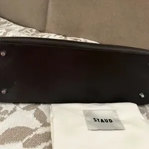 Structured STAUD satchel in smooth dark espresso leather. Dual top handles for hand or crook carry. Subtle logo embossing on front. Classic silhouette for versatile styling. Gorgeous! I bought, took iff tag-didn’t fit all my life stuff, but couldn’t return in timely way. Never used it is virtually new and pristine! Beautiful suede lining, one inside zip pocket, small exterior pocket at front of bag, hidden under flap when closed. This bag is super classic and just stunning!