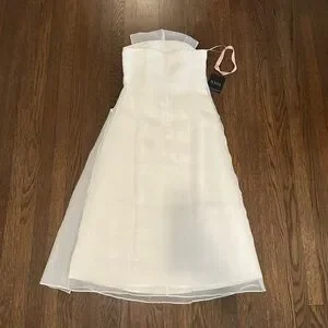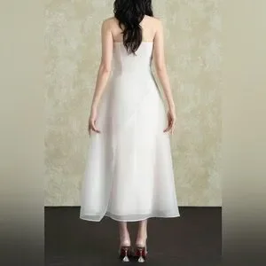 A classic strapless white midi dress with an artful draped bodice. Smooth, lightweight fabric and a subtle A-line skirt offer graceful movement. Clean lines and refined details create a sophisticated look for formal events. Designed to showcase a timeless white silhouette.