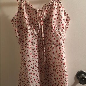 Size small CBR white dress with strawberry print .. has adjustable shoulder straps, front ties, softly elasticized back and back zipper. Made of 65 percent cotton and 35 percent polyester. Measurements are below: