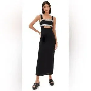 Keywords: STAUD, STAUD Mickey Dress, Staud dress, Staud black dress, Staud sequin, sequin trim dress, linen maxi, black linen dress, cutout maxi, sleeveless dress, open waist, tailored maxi, elegant evening dress, cocktail dress, minimalist dress, contemporary style, breathable linen, structured fit, statement trim, modern silhouette, fall fashion, holiday party dress, spring occasion, quiet luxury, sleek eveningwear, understated glamour, night out outfit, LBD, effortless chic, designer dress, LA label, timeless style, minimalist elegance