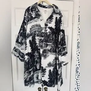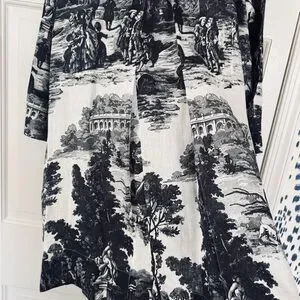 Relaxed midi dress with black scenic toile print on white. Button-down front with a classic collar. Lightweight woven fabric for easy layering. Artistic landscape motif for a refined casual look.